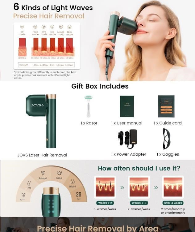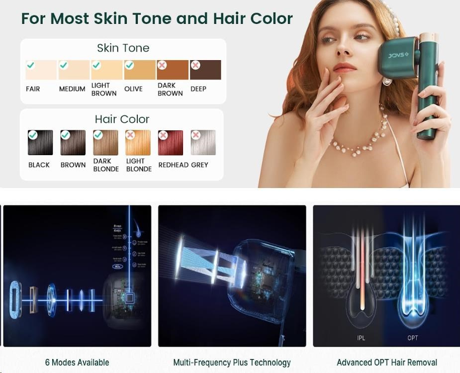 *Toto zariadenie môže používať ktokoľvek s typmi pleti I až V na Fitzpatrickovej stupnici. Ak máte veľmi tmavý odtieň pleti (typ VI), toto zariadenie prosím nepoužívajte. JOVS Pro II je možné použiť na ošetrenie tmavých blond až čiernych typov chlpu, ale nie na svetlé blond, zrzavé alebo šedivé chlpy.