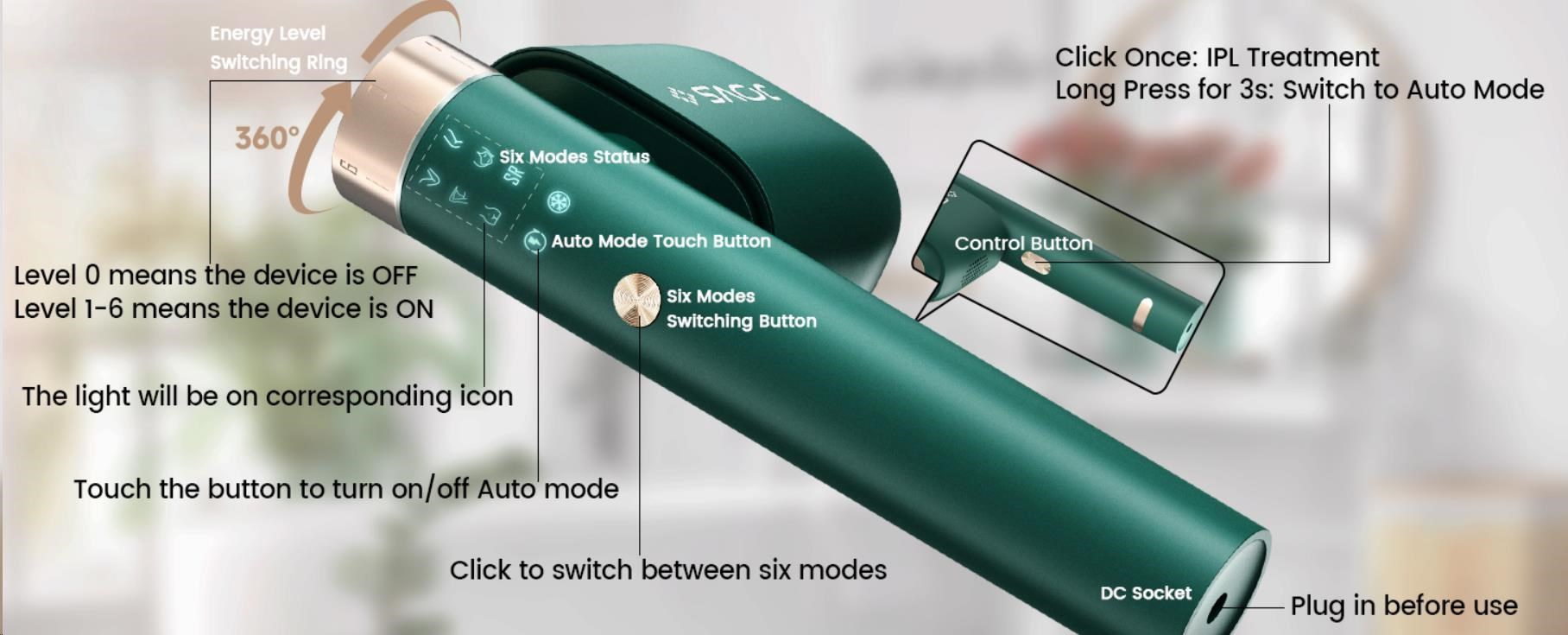 - Režimy: 6 (oblasť tvár, ruky, podpazušie, nohy, bikiny, omladenie pleti - SR)