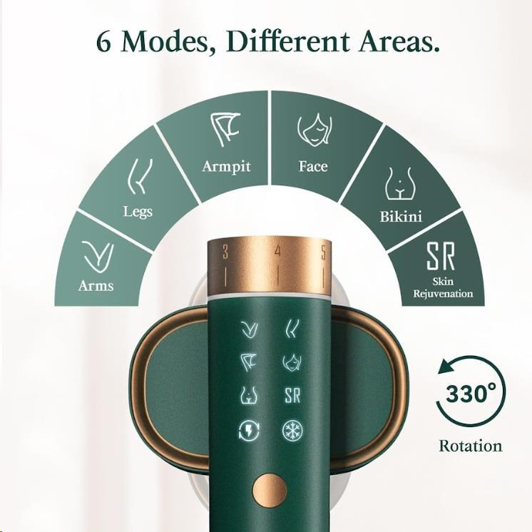 - Presné cielenie na každú partiu: 6 špecializovaných režimov pre tvár, ruky, nohy, podpazušie a oblasť bikín s 6 úrovňami intenzity.
