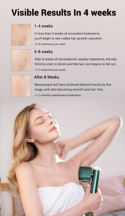 Použitie prístroja je neuveriteľne jednoduché a rýchle. Najskôr oholte oblasť, ktorú si prajete ošetriť. Potom jednoducho priložte hlavicu prístroja k pokožke a aplikujte jemný svetelný pulz priamo ku korienku chĺpku. Pre najlepšie výsledky odporúčame každé miesto ošetriť dvoma po sebe idúcimi zábleskami. Pre optimálne výsledky dodržiavajte nasledujúci plán: prvé dva týždne používajte prístroj trikrát týždenne, aby ste spomalili rast chĺpkov. Počas 3. a 4. týždňa znížte frekvenciu na dvakrát týždenne na dosiahnutie trvalého odstránenia chĺpkov. Po tejto úvodnej kúre stačí prístroj používať raz mesačne na prípadné udržiavacie ošetrenie a na zachovanie dokonale hladkej pokožky.