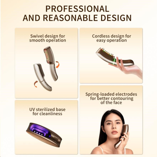 - Prémiový dizajn a hygiena: Otočná hlavica, pružinové elektrody a bezdrôtové prevedenie s UV dezinfekčnou základňou.