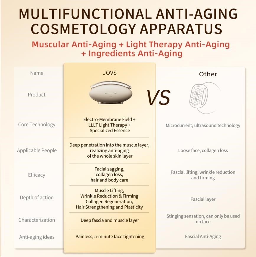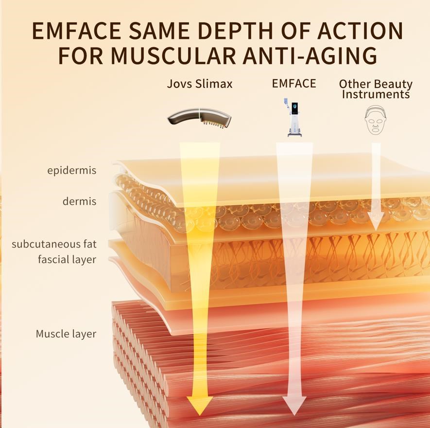Väčšina kozmetických prístrojov sa zameriava iba na dermis, teda na pokožku. Starnutie však začína hlbšie. Ak svaly pod kožou stratia svoju pevnosť, pokožka stratí svoju oporu a začne ochabovať a klesať – bez ohľadu na to, koľko kolagénu obsahuje. JOVS Slimax ako jediný využíva technológiu elektrických pulzných vĺn CET (Collagen Electrophoretic Techniques), ktorá vysiela signály priamo do svalovej vrstvy, stimuluje ich aktivitu a obnovuje tak pevnú základňu celej tváre.