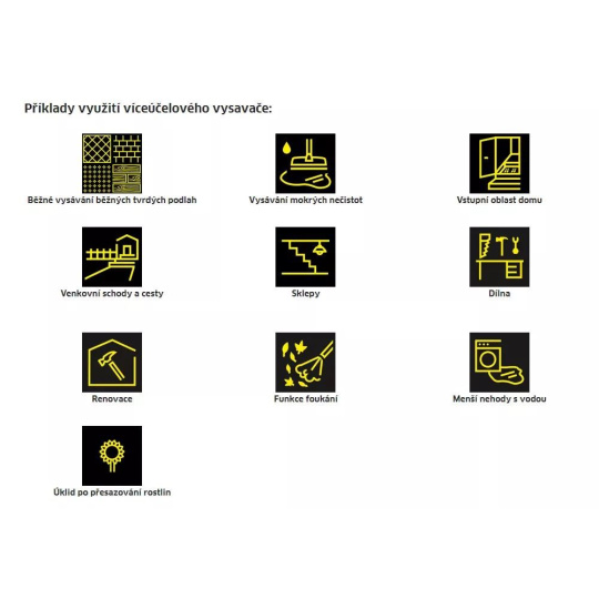 mokré, jemné alebo hrubé nečistoty so spotrebou 1100 wattov. Zariadenie je dodávané s robustnou plastovou nádobou objemu 25 litrov, 5-metrovou šnúrou, 2,2-metrovou sacou hadicou s odnímateľnou,
