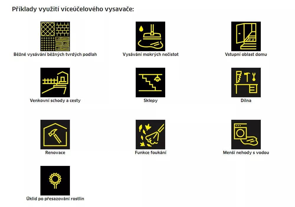 mokré, jemné alebo hrubé nečistoty so spotrebou 1100 wattov. Zariadenie je dodávané s robustnou plastovou nádobou objemu 25 litrov, 5-metrovou šnúrou, 2,2-metrovou sacou hadicou s odnímateľnou,