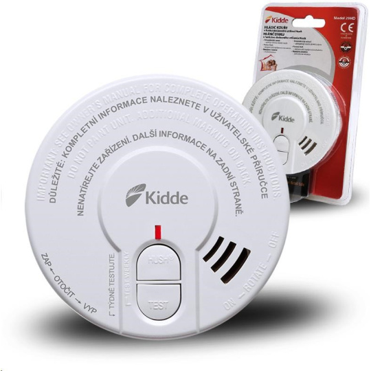 Hasiaci prístroj je vybavený testovacím tlačidlom TEST na kontrolu správneho fungovania zariadenia a HUSH na krátkodobé umlčanie požiarnej signalizácie v prípade planého poplachu. Stlačenie tlačidla spôsobí okamžitú deaktiváciu alarmu na približne 10 minút, zníženie citlivosti obvodov a vypnutie akustickej signalizácie hlásiča. Tlačidlo HUSH používajte iba v prípade, že poznáte príčinu aktivácie hlásiča (napr. pri varení alebo smažení). Po cca 10 minútach od deaktivácie sa hlásič automaticky resetuje do pôvodného nastavenia na monitoring požiarneho nebezpečenstva. Ak v miestnosti zostane vysoká koncentrácia koure, môžete tlačidlo HUSH opakovane stláčať, až kým miestnosť nebude riadne vyvetraná. Tento model je vybavený najmodernejším fotoelektrickým senzorom Kidde.