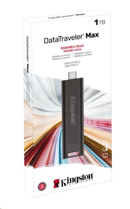 Kingston DataTraveler® Max je vysoko výkonný flash disk USB typu C®1ktorý využíva najnovší štandard USB 3.2 2. generácia pre rýchlosť čítania/zápisu záznamov do 1000/900 MB/s2. Jedinečné tvarované puzdro, navrhnuté s ohľadom na prenosnosť a pohodlie, chráni konektor, keď sa nepoužíva, a možno ho ľahko premiestniť jediným pohybom. DT Max ponúka vynikajúci výkon a rozšírenú kapacitu až do 1 TB3, čo z neho robí ideálne riešenie na prenos a ukladanie veľkých digitálnych súborov, ako sú fotografie v rozlíšení HD, videá v rozlíšení 4K/8K, hudba a ďalšie.