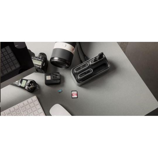 Stanica workflows a čítačky od Kingston poskytujú flexibilný systém na prenos videa, fotografií a zvuku z viacerých zdrojov naraz.* Urýchlite svoj pracovný proces postprodukcie a vytvorte nastavenie na prekladanie súborov, ktoré vyhovuje vašim potrebám. Dock stanice workflows je prispôsobiteľný, takže môžete použiť iba USB miniHub, SD čítačky alebo microSD čítačky, ktoré si vyžaduje vaša natáčacia scéna. Či už natáčate v 4K/8K s multi-kamerou s prenosnými nahrávačmi zvuku pre každého hostiteľa alebo natáčate B-Roll s dronmi a GoPro kamerami, môžete súčasne pripojiť až štyri čítačky k docku a rýchlo prenášať zábery. Stanica workflows a čítačky podporujú rýchlosti USB 3.2, vďaka čomu sa dostanete k procesu postprodukcie rýchlejšie než kedykoľvek predtým. Pre väčšiu flexibilitu je možné čítačky kariet použiť aj na cestách. Keď potrebujete natáčať na mieste, stačí vložiť hub alebo čítačky, ktoré potrebujete, do tašky a pripojiť ich k notebooku pomocou priloženého kábla USB-C®.