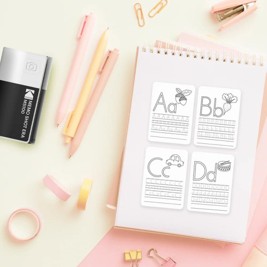 Fotoaparát s tlačením etikiet inšpirovaný ikonickým dizajnom filmových kaziet Kodak. Vyfoťte snímky a ihneď ich vytlačte, alebo pripojte telefón a tlačte obrázky z galérie na etiketa papier o veľkosti 2,7 × 1,8" prostredníctvom aplikácie KODAK MEMO.
