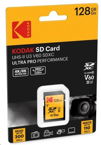 Pamäťová karta KODAK SDXC ULTRA PRO PERFORMANCE UHS-II U3 V60 je určená pre profesionálnych aj pokročilých fotografov, ktorí využívajú DSLR, UHD, 360°, 4K a 8K kamery. Vďaka extrémne vysokým rýchlostiam čítania a zápisu zvláda sekvenčné snímanie, natáčanie vo Full HD, 3D, 4K aj 8K UHD a rýchly prenos veľkých súborov.