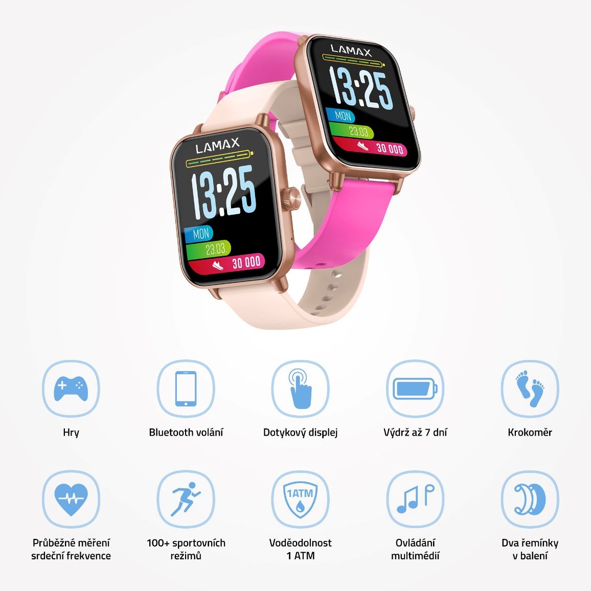 Súčasťou balenia hodiniek sú dva remienky, svetlý a tmavý ružový, pre jednoduchú výmenu podľa nálady.