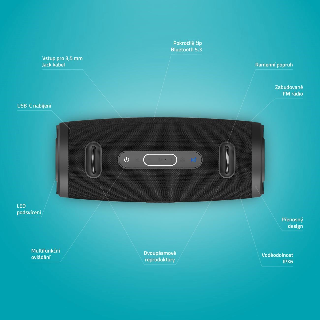Je jedno, či máš playlist na párty na jednom zariadení a obľúbený podcasty na inom, cez najmodernejšie Bluetooth 5.3 sa reprák automaticky spáruje s akýmkoľvek zariadením a frčí na vzdialenosť 15 metrov. Trápiť ťa nemusia ani formáty, táto mašinka podporuje MP3, WAV, FLAC a široká je aj škála podporovaných pripojení - Micro SD, USB-A, 3,5 mm AUX. Parádnou záležitosťou je tiež možnosť naladenia FM rádia napríklad pre prípady, keď si zabudneš vlastnú muziku. A keďže každá udalosť si žiada správnu atmošku, máš na výber z 5 nastaviteľných LED efektov.