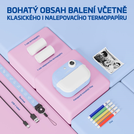 LAMAX InstaKid2 Play je foťák, ktorý nestráca čas. Deti si s ním jednoducho zaznamenajú každý dôležitý moment a počas sekundy ho majú v ruke. Čiernobiele snímky sa môžu premeniť na farebné spomienky pomocou fixiek, ktoré sú súčasťou balenia – stačí ich len vyfarbiť, pridať do vlastného albumu alebo nimi potešiť napríklad babičku. Vďaka jednoduchému ovládaniu, dvom ruličkám v balení (vrátane samolepiacej), originálnemu dizajnu a výkonnej kamere so 48 Mpx a FullHD videom, sa foťák stane nepostrádateľným spoločníkom na výlety, oslavy aj tvorivá popoludní s kamarátmi. Obľúbia si ho aj staršie deti, ktoré si môžu svoje snímky aj videá ukladať na microSD kartu a uchovať si tak svoje prvé filmárske pokusy. Na výber je ružová alebo modrá varianta a nechýba ani praktická šnúrka na krk, aby mali deti foťák stále po ruke. A keď práve nefotí? Zábavu zaistí päť hier priamo vo fotoaparáte. Tento foťáčik totiž nie je len o spomienkach, je tiež o radosti, sebavyjadrení a fantázii.