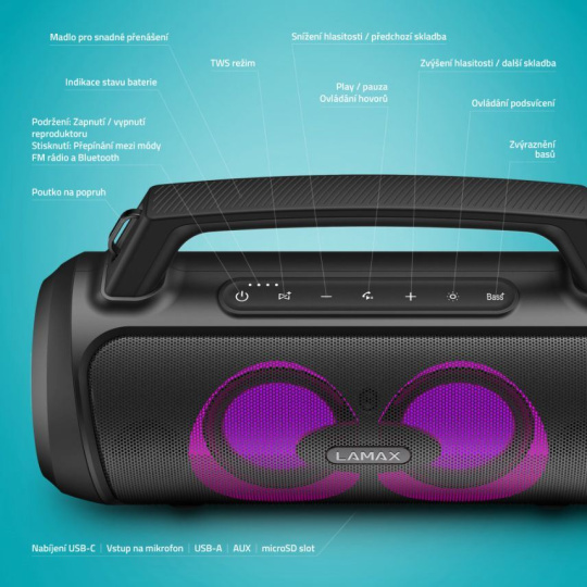 Malé telo a veľký výkon čo naladí aj rádioUdávaj tón každej party s prenosným reproduktorom LAMAX PartyGo1 Play. Jeho neveľké telo so šikovným madlom ukrýva značný výkon 50 W. Kdekoľvek si len spomenieš, naservíruje ti silný, plný a bohatý zvuk vďaka technológii BeatBass®. Či už sa jedná o poriadnu párty alebo záhradnú grilovačku, vždy im dodajú ten správny vibe aj 3 režimy LED podsvietenia a pribalený mikrofón, s ktorým si užiješ super karaoke alebo môžeš akciu moderovať. Bluetooth 5.3 zariadi okamžité spárovanie repráku s akýmkoľvek zariadením a istotu bezchybného prenosu až na 18 m. Pripojiť ho možno ale aj cez USB, microSD, prípadne AUX a vie sa premeniť v powerbanku cez USB-A vstup. Poriadnu muziku si užiješ aj na cestách, batéria repráku vydrží až 15 hodín a vďaka praktickému popruhu si ho pohodlne hodíš cez rameno. Pokiaľ je jeden reprák málo, pomocou True Wireless technológie ho pohodlne spáruješ s ďalším. Nemáš práve po ruke svoj playlist? Využi FM rádio, ktorý ľahko naladíš. Reproduktor podporuje hlasových asistentov a ovládneš s ním aj telefónne hovory.