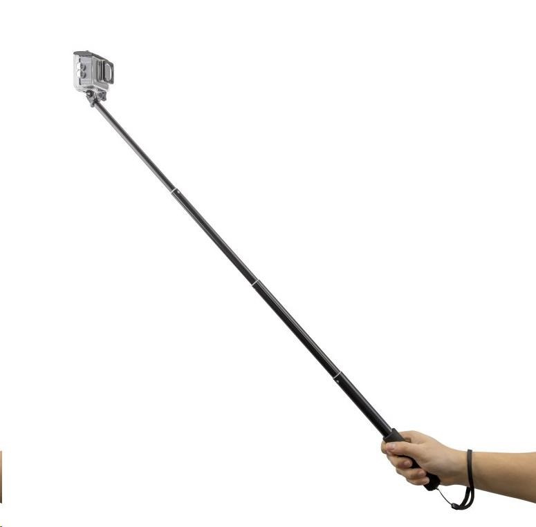 Držiak je vybavený rukoväťou s pohodlným gumovým protišmykovým povrchom, s pútkom a statívovým závitom na spodnom konci, aby ste mohli monopod pripojiť k ďalšiemu príslušenstvu. Na hornom konci tyče je adaptér na jednoduché pripojenie akčnej kamery akejkoľvek značky.