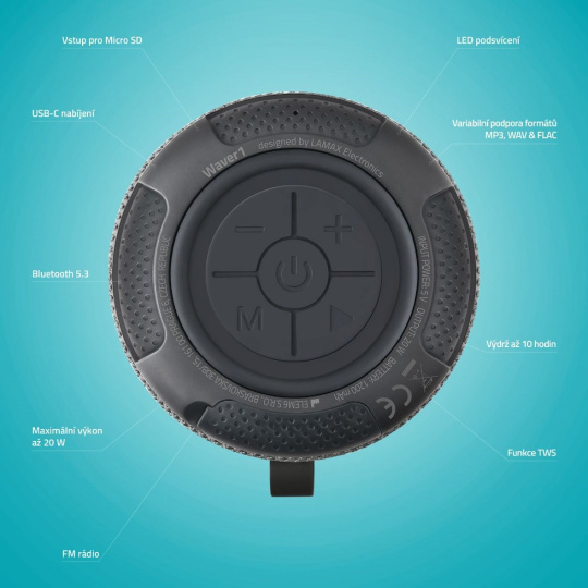 LAMAX Waver1 je kompaktný moderný fešák, ktorému skrátka neodoláš. Jeho ergonomický koženkový dizajn nie je iba ľúbivý, ale aj praktický. Môžeš ho so sebou vziať kamkoľvek, stačí mu fakt málo miesta a vďaka vodeodolnosti IP65 mu neuškodí ani vlhkejšie prostredie napríklad v lete pri bazéne. Aj keď má výdrž, občas potrebuje doplniť šťavu, na to slúži USB-C kábel.