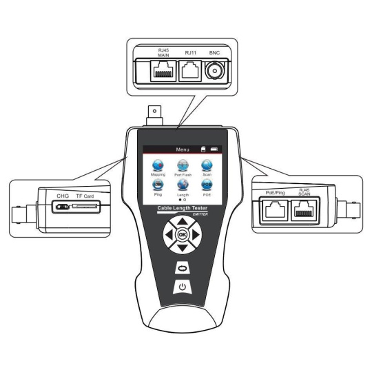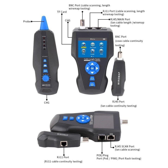 Pokročilý tester na testovanie a diagnostiku rôznych typov káblov/vedení. Využíva technológiu TDR (Time Domain Reflectometry) na presnú lokalizáciu a identifikáciu porúch v linkách. Zariadenie je vybavené veľkým LCD displejom, ktorý zobrazuje všetky relevantné informácie a podporuje viacjazyčné nastavenia. Okrem toho je vybavený vstavaným generátorom tónov a funkciou vyhľadávania portov, vďaka čomu je ideálny na testovanie sieťových káblov, telefónnych liniek a video káblov.