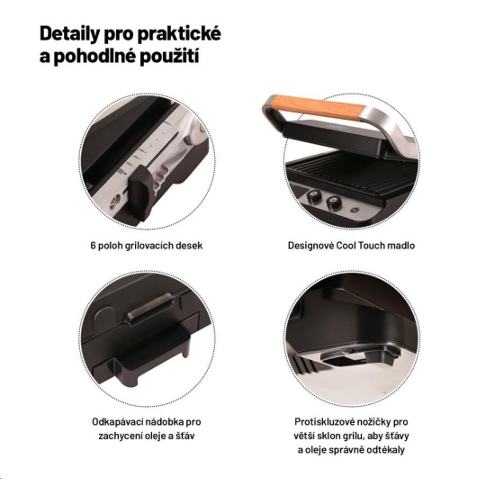 Platničky grilu majú nastaviteľnú polohu. Môžete napríklad upraviť výšku a sklon platničky tak, aby sa znížil tlak pôsobiaci na krehké suroviny, ako sú napríklad čerstvé ryby. V BBQ móde si pri každej platničke môžete nastaviť požadovanú teplotu ohrevu samostatne. S správnou voľbou teploty pre jednotlivé druhy potravín vám pomôže príložený sprievodca. Zároveň si pre každý pokrm môžete nastaviť požadovaný čas prípravy, takže sa nemusíte báť, že netrafíte správny stupeň prepečenia. Gril je vybavený funkciou automatického vypnutia, vďaka vysokému výkonu sa veľmi rýchlo zohrieva a o priebehu prípravy máte prehľad vďaka LED displeju. V ponuke sú aj ploché platničky pre ešte širšie možnosti grilu.