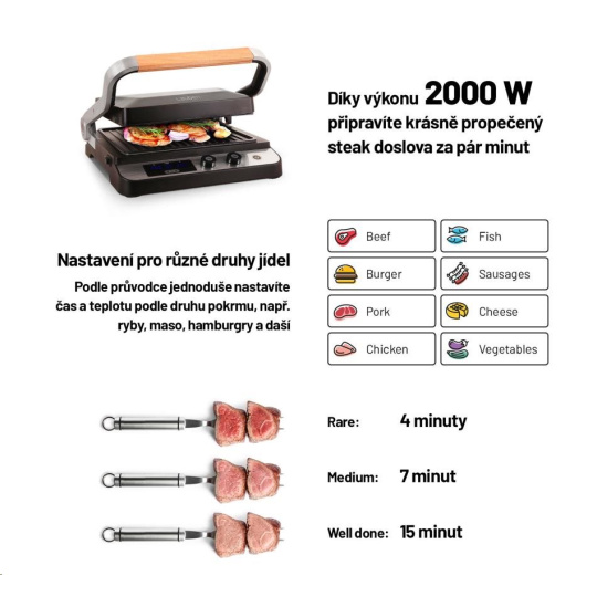 Gril vďaka výkonu 2000 W sa veľmi rýchlo zohrieva a poradí si aj so steakmi, ktoré vyžadujú prudké opečenie pri vysokej teplote.