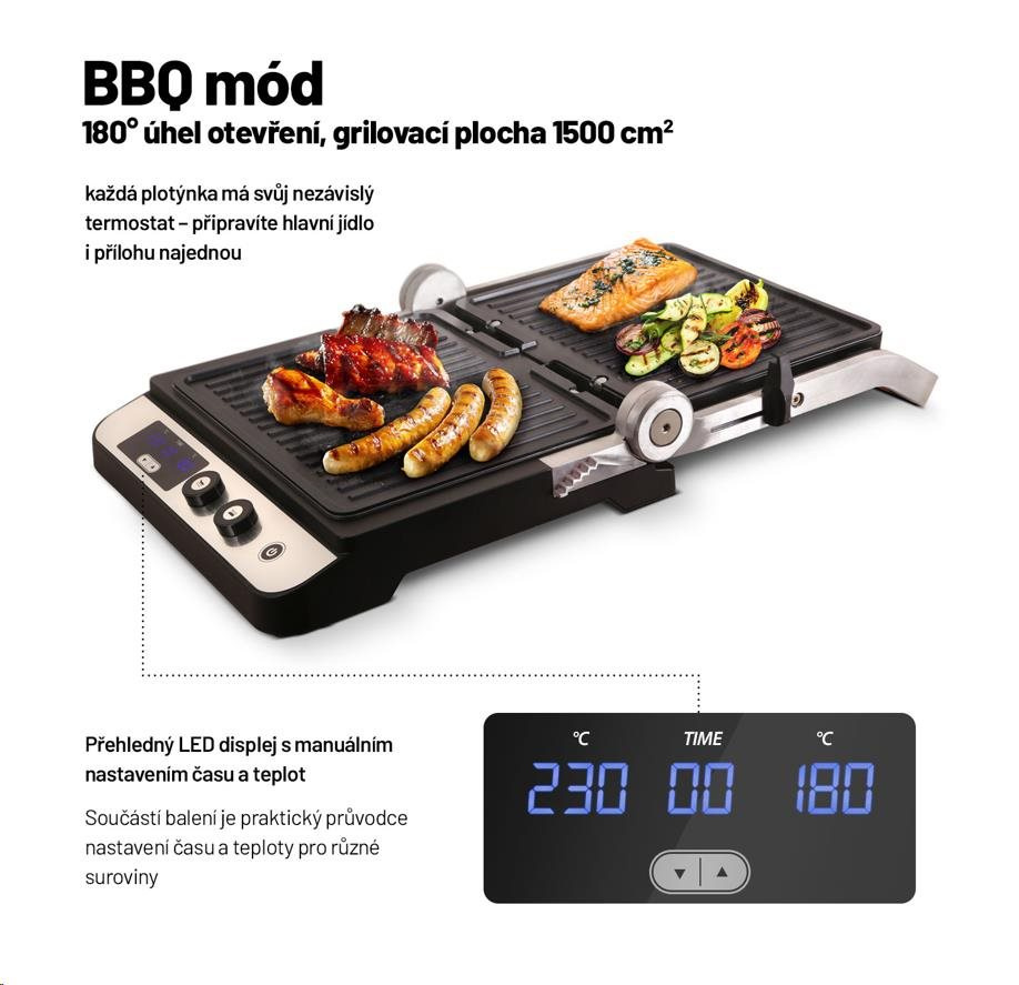 Platničky grilu majú nastaviteľnú polohu. Môžete napríklad upraviť výšku a sklon platničky tak, aby sa znížil tlak pôsobiaci na krehké suroviny, ako sú napríklad čerstvé ryby. V BBQ móde si pri každej platničke môžete nastaviť požadovanú teplotu ohrevu samostatne. S správnou voľbou teploty pre jednotlivé druhy potravín vám pomôže príložený sprievodca. Zároveň si pre každý pokrm môžete nastaviť požadovaný čas prípravy, takže sa nemusíte báť, že netrafíte správny stupeň prepečenia. Gril je vybavený funkciou automatického vypnutia, vďaka vysokému výkonu sa veľmi rýchlo zohrieva a o priebehu prípravy máte prehľad vďaka LED displeju. V ponuke sú aj ploché platničky pre ešte širšie možnosti grilu.