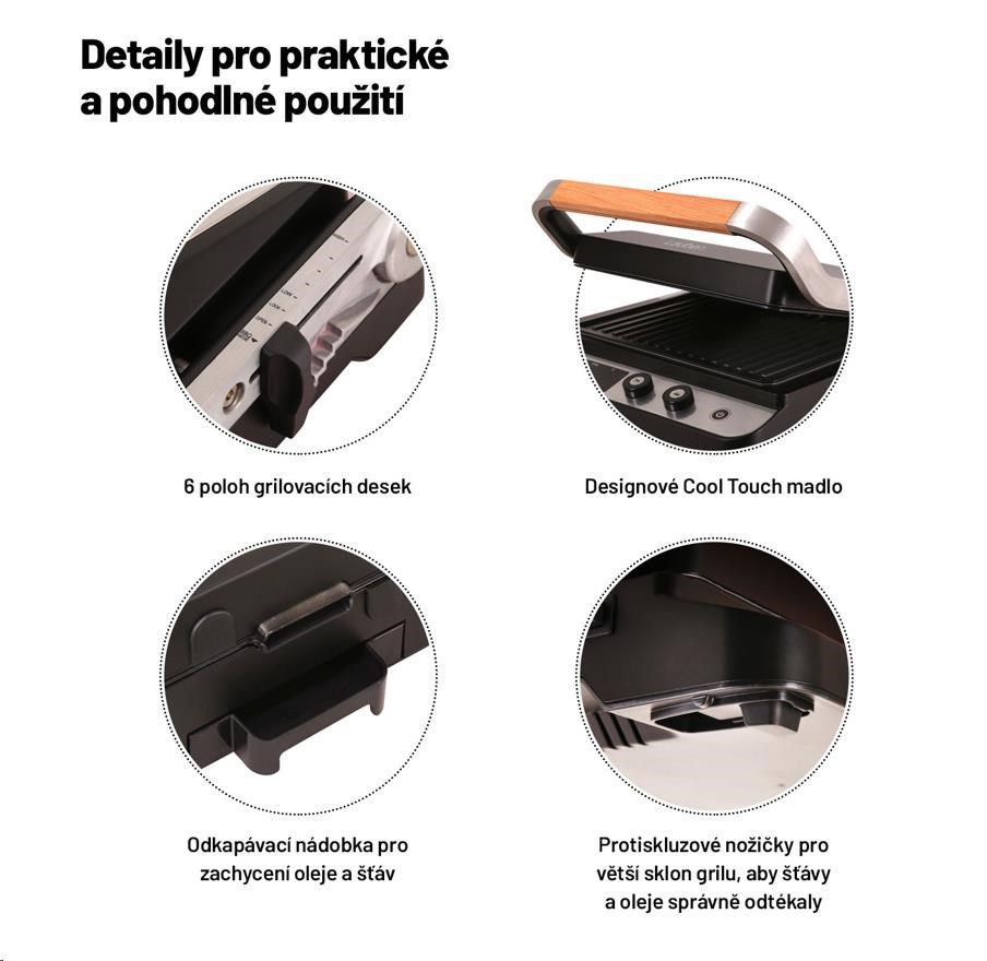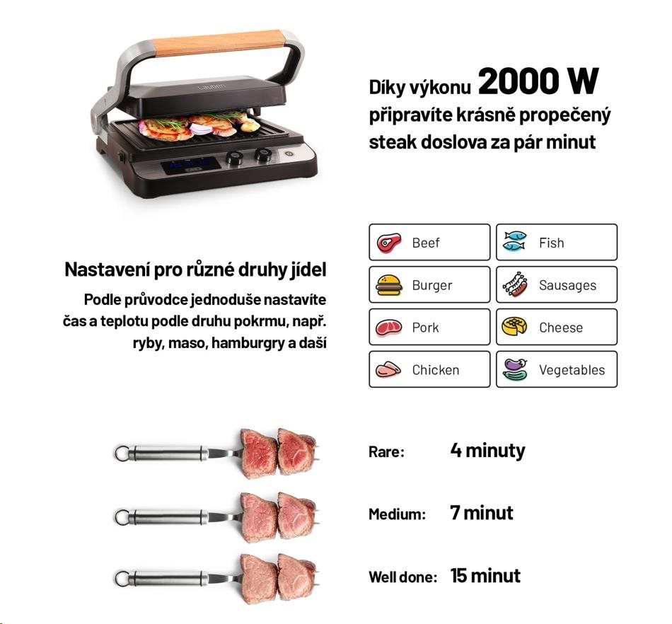 Gril vďaka výkonu 2000 W sa veľmi rýchlo zohrieva a poradí si aj so steakmi, ktoré vyžadujú prudké opečenie pri vysokej teplote.