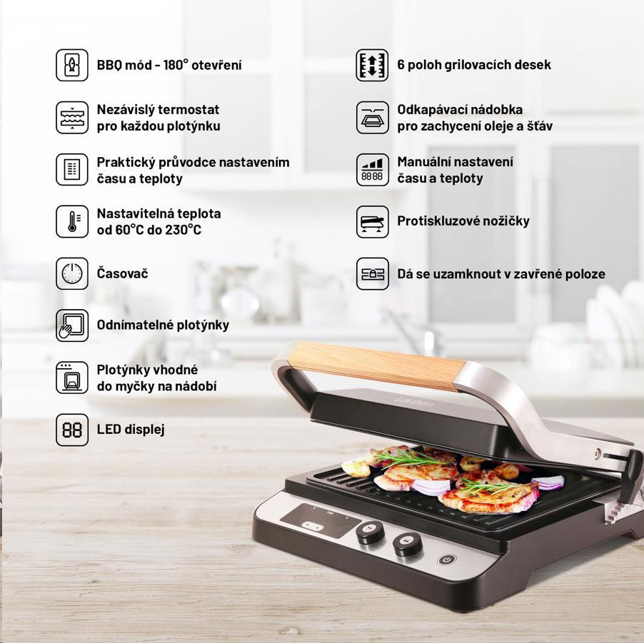 Zdravé grilovanie po celý rokPre slnečné dni letnej sezóny neodmysliteľne patrí vonkajšie grilovanie. S kontaktným grilom Lauben si však môžete šťavnatý burger alebo čerstvú rybu vychutnať bez ohľadu na počasie, kedykoľvek počas roka. Tento flexibilný pomocník spája možnosti zapekacieho kontaktného grilu a plnohodnotného stolného grilu. Je už len na vás, či sa rozhodnete pripraviť si rýchle domáce panini, alebo gril nastavíte do BBQ módu a usporiadate večierok s grilovaním pre priateľov. Vďaka výkonu 2000 W si gril bez problémov poradí aj s prudkým opečením, ktoré je potrebné pri kvalitných steakoch, disponuje dostatočnou grilovacou plochou 1500 cm2, regulátorom teploty a časovačom. Plotýnky grilu sú odnímateľné, každá z nich je možné samostatne nastaviť teplotu ohrevu a vy tak môžete pripraviť rôzne druhy potravín súčasne. Teplota ohrevu sa dá nastaviť v rozmedzí od 60 do 230 °C, vhodnými teplotami pre jednotlivé druhy potravín vás prevedie príložený sprievodca. Súčasťou grilu je praktická miska na odkápavanie prebytočného tuku a šťavy. Príjemným bonusom je kvalitný dizajnový výzor vhodný do exteriéru aj interiéru.