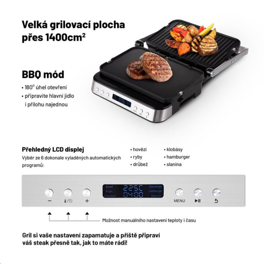 Gril ponúka 6 automatických programov, ktoré sú na mieru ušité rôznym surovinám. Teplotu aj čas prípravy môžete nastaviť takisto manuálne, gril si vašu voľbu zapamätá a môžete ju využiť aj nabudúce.