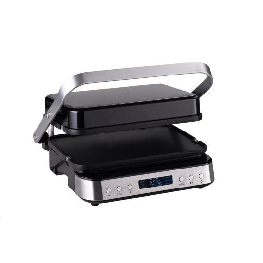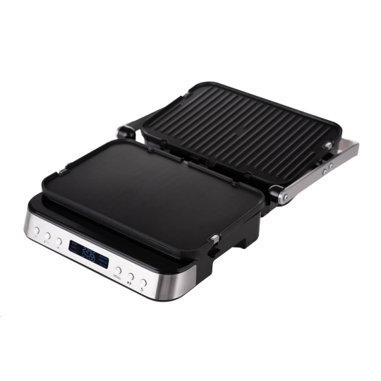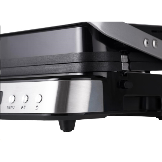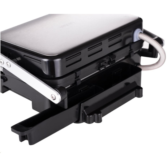 Kontaktný gril na zapekanie, ktorý po uvedení do vodorovnej polohy pretvoríte na plnohodnotný stolný gril s plochou 1400 cm2.