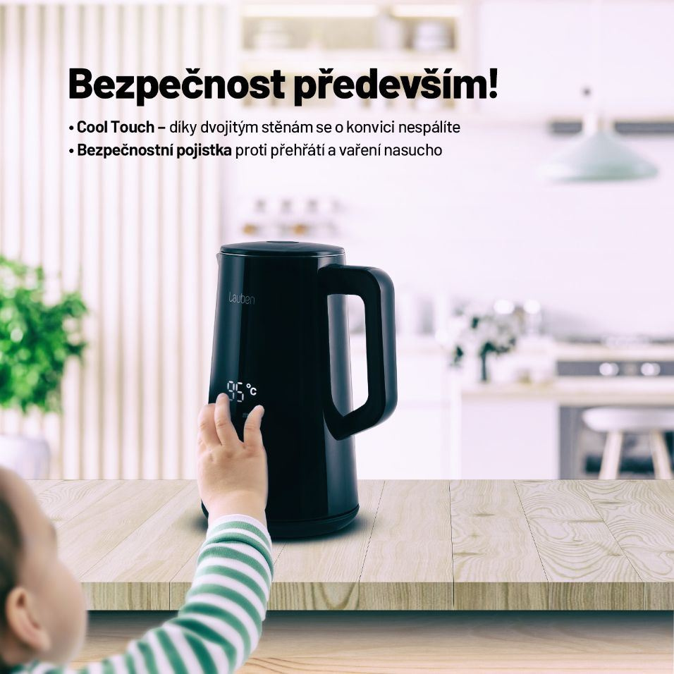 Bezpečnosť je vždy na prvom mieste, preto je rýchlovarná kanvica Lauben Electric Kettle 1800BC vybavená technológiou Cool Touch, ktorá zabraňuje popáleniu vďaka dvojitým stenám, z ktorých vonkajšia nie je nikdy príliš horúca. Dôležitým bezpečnostným prvkom je aj pojistka proti prehriatiu a vareniu nasucho. Údržbu uľahčuje integrovaný filter zachytávajúci častice a nečistoty z vody. Na jednoduchú manipuláciu sa postará aj základňa otočná o 360° a otváracie tlačidlo umiestnené na vieku kanvice.