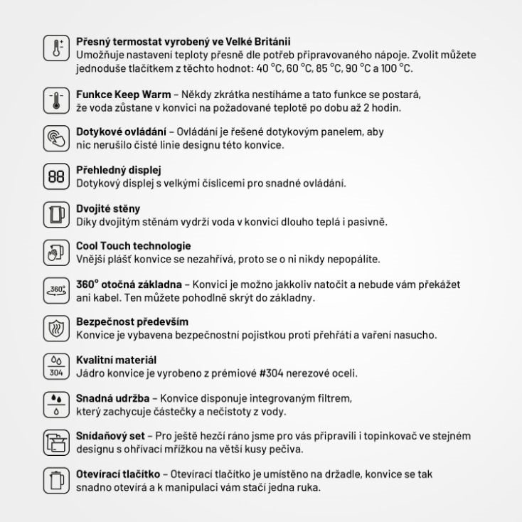 Niekedy zkrátka nestíhame a táto funkcia zabezpečí, že voda zostane v kanvici na požadovanej teplote až po dobu 2 hodín.