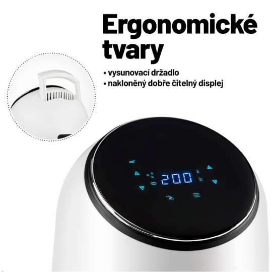 Ovládanie fritéry je intuitívne a zvládne ho každý. Požadovaný režim si nastavíte na dotykovom displeji, na ktorom môžete sledovať teplotu a dobu prípravy. Displej je navyše ideálne naklonený, takže na neho vždy pohodlne vidíte. Vyprážanú nádobu ľahko uchopíte vďaka praktickému držadlu, a keď skončíte s prípravou jedla, môžete ju bez problémov dať do umývačky riadu. Ak nemáte radi manuály, určite vás poteší video tutorial, ktorý spustíte naskenovaním QR kódu.