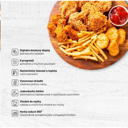 Fritéza sa veľmi ľahko ovláda vďaka prehľadnému dotykovému displeju a hlavná časť je možné umývať v umývačke riadu. Vyčarí vám aj vkusný minimalistický dizajn.