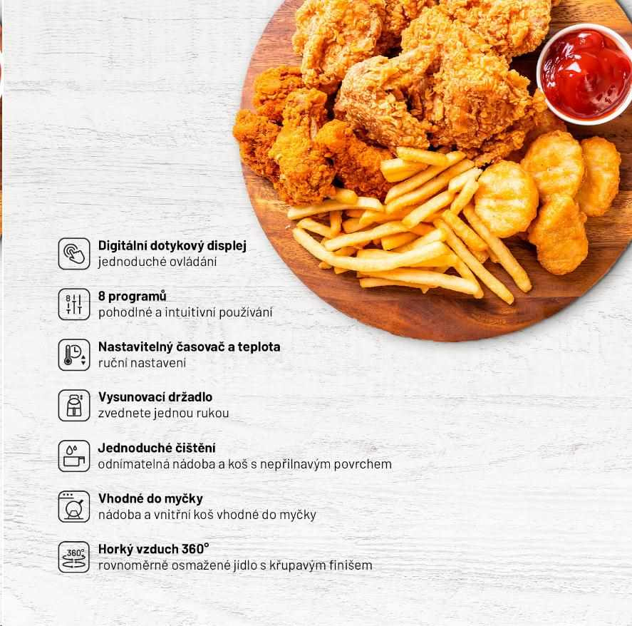 Na vyprážanie neodmysliteľne patrí veľa tuku, a preto sa tohto lákavého spôsobu úpravy často vyhýbame. S horkovzdušnou fritézou Lauben si môžete vychutnať svoje obľúbené jedlo s čistým svedomím. Vďaka 360° cirkulácii horúceho vzduchu ho totiž pripravíte aj bez tuku. Jedlo tak nebude mastné, ale zároveň si zachová chrumkavosť, chuť, vôňu i správnu štruktúru.