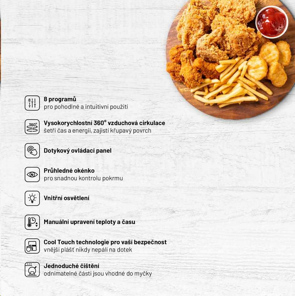 Až o 70% menej elektrickej energie oproti rúre; až o 85% menej tuku a o 50% rýchlejšie hotové.