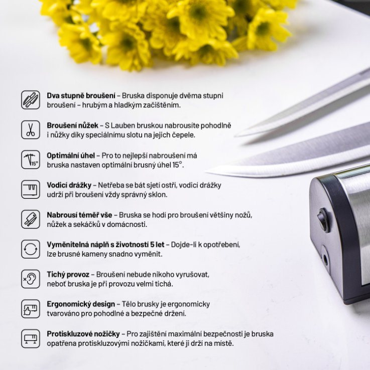 Vždy dobre nabroušené ostrieDobre naostrený nôž je základom kuchyne. Dnes už ale nemusíte hľadať brusiča nožov, vďaka Bruske na nože Lauben Nôž na ostrenie 4700SB ju budete mať stále po ruke. Bruska zvládne hrubé aj hladké doostrenie a hodí sa pre väčšinu nožov, sekáčov či nôžok. Kvalitné naostrenie zabezpečuje optimálny brusný uhol 15° a vodicí drážky pre udržanie správneho sklonu. Brúsny kameň je v prípade potreby možné vymeniť, životnosť je približne päť rokov. Bruska má ergonomický tvar, vyznačuje sa tichým prevádzkou a je vyrobená z nerezu, takže ju len tak niečo nepoškodí. Bezpečnosť pri prevádzke zabezpečujú protisklzové nôžky.