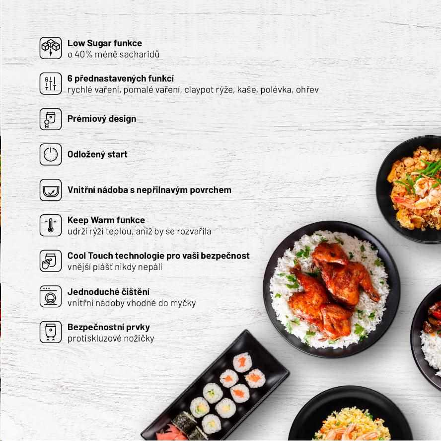 Ríza s až o 40 % nižším obsahom sacharidovLauben Low Sugar Rice Cooker je viacúčelový prémiový ryžovar s funkciou low sugar, pri ktorej vďaka špeciálnej technológii varenia dochádza k separácii sacharidov. S týmto pomocníkom doveste k dokonalosti všetky druhy ryže a vďaka 6 nastaviteľným režimom rýchlo vytvoríte zdravé a chutné jedlá aj z ďalších surovín. S ryžovarom Lauben pripravíte lusťiny, polievku alebo napríklad bez toho, aby ste zapli sporák.