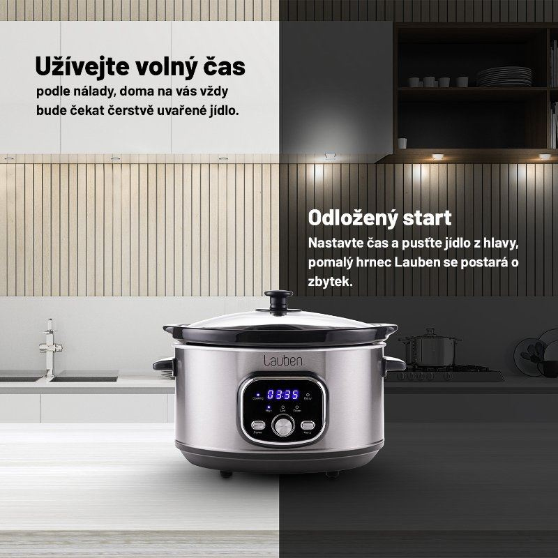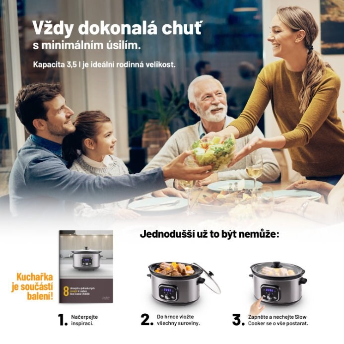 Pomalé varenie usporí čas strávený v kuchyni. Znie to nepravdepodobne, ale je to tak. Pomalý hrniec totiž varí síce pomaly, ale sám. Do hlavnej nádoby umiestnite všetky ingrediencie, stlačíte tlačidlo a o zvyšok sa postará hrniec. Už ste niekedy pripravili guláš bez státia pri sporáku za neustáleho stráženia a miešania? Predstavte si, že stlačíte večer tlačidlo, idete si čítať alebo cvičiť, o kuchyňu sa nestaráte, a ráno je obed hotový a ešte k tomu perfektný. S Lauben Slow Cooker 3500SB sa tato predstava stáva realitou.