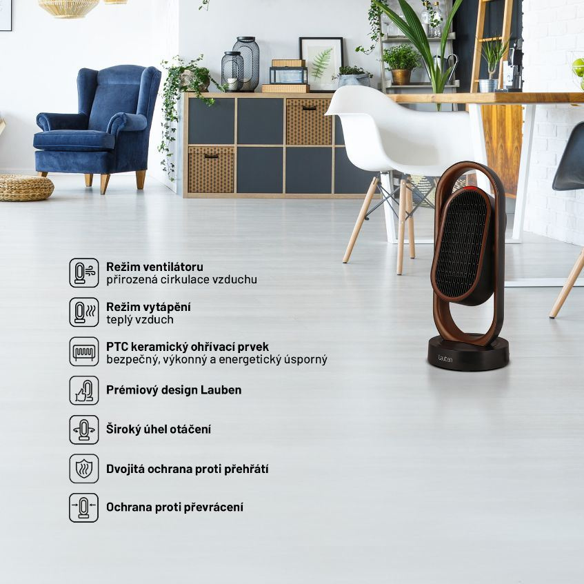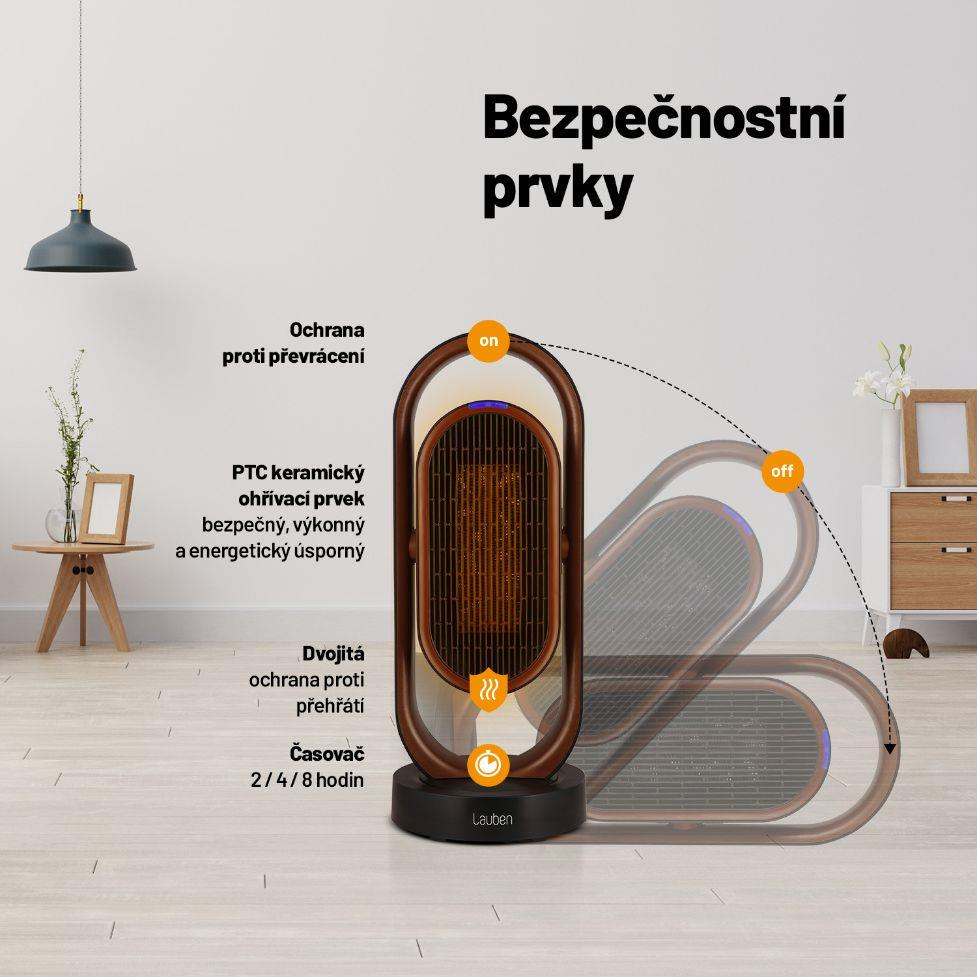 Dokonalý high end Lauben dizajn sa vyníma v každom priestore a 20 m2 dokonale ovládne aj vďaka širokému uhla záberu, kedy sa do strán pohybuje až v uhle 80° a hore/dole v uhle 45°. Nielen funkčnosť a dizajn sú však dôležité, na prvom mieste stojí bezpečnosť. Tú zaisťuje dvojitá poistka proti prehriatiu a poistka proti prevrhnutiu, ktoré v krízovej situácii prístroj vypnú.