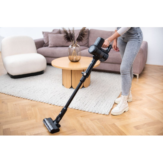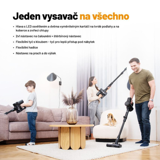 Zberač nečistôt umiestnený v hornej časti prístroja a flexibilná tyč s kĺbom umožňujú jednoduché upratovanie aj pod nábytkom alebo v úzkych priestoroch. Naopak, špeciálne ohnuté nadstavce na prach a do výšok umožňujú pohodlné upratovanie na skrinkách. Do ťažko dostupných miest sa dostane flexibilná hadica, a zvlášť majitelia domácich maznáčikov ocenia hlavu s motorickými výmennými kefami, pričom antistatická je určená na tvrdé podlahy a ďalší nadstavec na koberce a zvieracie chlpy.