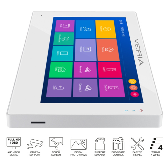 Monitor VERIA 3001-W je plne dotykový farebný LCD panel a ponúka užívateľsky jednoduché ovládanie a nastavovanie. Umožňuje meniť vzhľad menu na štýly android alebo Windows, v režime spánku môže zobrazovať hodiny, alebo zobrazovať snímky uložené na SD karte a tak vám spríjemniť čas spomienkami.