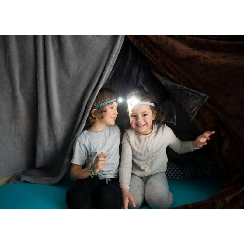 Detské čelovky s motívmi dúhy alebo dinosaurov, výkon 5-40 lm, biele, modré a červené svetlo, doba svietenia až 18 hodín, šetrné ku detskému zraku, bezpečný kryt dobíjacieho akumulátora, jednoduché ovládanie.