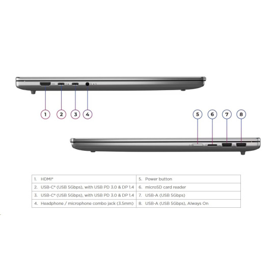 | Standartné porty | 1x USB-A (USB 5Gbps / USB 3.2 Gen 1) 1x USB-A (USB 5Gbps / USB 3.2 Gen 1), Always On 2x USB-C® (USB 5Gbps / USB 3.2 Gen 1), with USB PD 3.0 and DisplayPort™ 1.4 1x HDMI® 2.1, up to 4K/60Hz 1x Headphone / microphone combo jack (3.5mm) 1x microSD card reader |