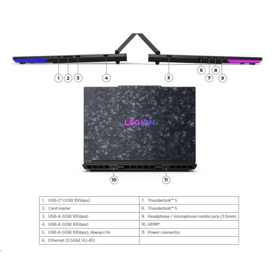 | Standartné porty | 2x USB-A (USB 10Gbps / USB 3.2 Gen 2) 1x USB-A (USB 10Gbps / USB 3.2 Gen 2), Always On 1x USB-C® (USB 10Gbps / USB 3.2 Gen 2) 2x USB-C® (Thunderbolt™ 5 / USB4® Version 2 80Gbps), with USB PD 95-100W and DisplayPort™ 2.1 1x HDMI® 2.1, up to 8K/60Hz 1x Headphone / microphone combo jack (3.5mm) 1x Ethernet (2.5GbE RJ-45) 1x Card reader 1x Power connector |