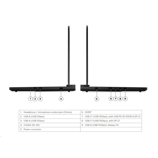 | Standartné porty | 2x USB-A (USB 5Gbps / USB 3.2 Gen 1) 1x USB-A (USB 10Gbps / USB 3.2 Gen 2), Always On 1x USB-C® (USB 10Gbps / USB 3.2 Gen 2), with DisplayPort™ 2.1 1x USB-C® (USB 10Gbps / USB 3.2 Gen 2), with USB PD 65-100W and DisplayPort™ 2.1 1x HDMI® 2.1, up to 8K/60Hz 1x Headphone / microphone combo jack (3.5mm) 1x Ethernet (2.5GbE RJ-45) 1x Power connector |