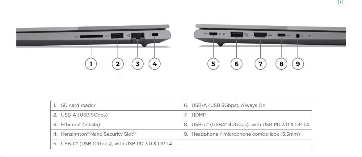 | Standartné porty | 1x USB-A (USB 5Gbps / USB 3.2 Gen 1) 1x USB-A (USB 5Gbps / USB 3.2 Gen 1), Always On 1x USB-C® (USB 10Gbps / USB 3.2 Gen 2), with USB PD 3.0 and DisplayPort™ 1.4 1x USB-C® (USB4® 40Gbps), with USB PD 3.0 and DisplayPort™ 1.4 1x HDMI® 2.1, up to 4K/60Hz 1x Headphone / microphone combo jack (3.5mm) 1x Ethernet (RJ-45) 1x SD card reader |