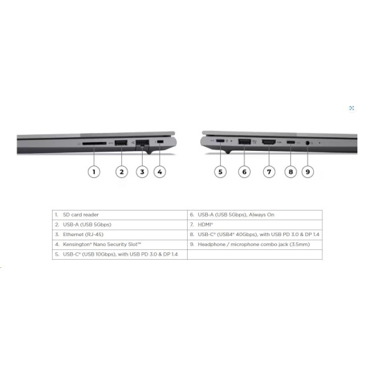 | Standartné porty | 1x USB-A (USB 5Gbps / USB 3.2 Gen 1) 1x USB-A (USB 5Gbps / USB 3.2 Gen 1), Always On 1x USB-C® (USB 10Gbps / USB 3.2 Gen 2), with USB PD 3.0 and DisplayPort™ 1.4 1x USB-C® (USB4® 40Gbps), with USB PD 3.0 and DisplayPort™ 1.4 1x HDMI® 2.1, up to 4K/60Hz 1x Headphone / microphone combo jack (3.5mm) 1x Ethernet (RJ-45) 1x SD card reader |