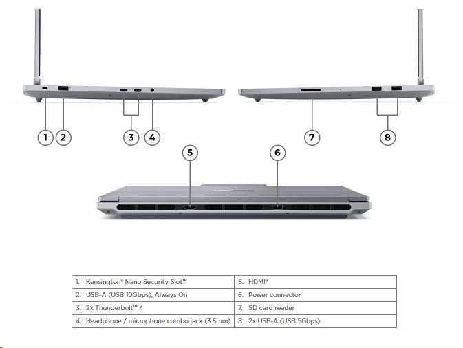 | Standartné porty | 2x USB-A (USB 5Gbps / USB 3.2 Gen 1) 1x USB-A (USB 10Gbps / USB 3.2 Gen 2), Always On 2x USB-C® (Thunderbolt™ 4 / USB4® 40Gbps), with USB PD 3.0 and DisplayPort™ 2.1 1x HDMI® 2.1, up to 8K/60Hz 1x Headphone / microphone combo jack (3.5mm) 1x SD card reader 1x Magic Bay (pogo pin connector) 1x Power connector |