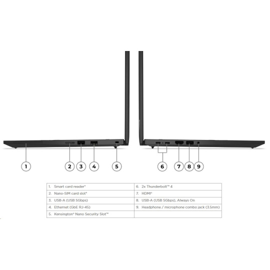| Standartné porty | 1x USB-A (USB 5Gbps / USB 3.2 Gen 1) 1x USB-A (USB 5Gbps / USB 3.2 Gen 1), Always On 2x USB-C® (Thunderbolt™ 4 / USB4® 40Gbps), with USB PD 3.0 and DisplayPort™ 1.4 1x HDMI® 2.1, up to 4K/60Hz 1x Headphone / microphone combo jack (3.5mm) 1x Ethernet (RJ-45) 1x Security keyhole |