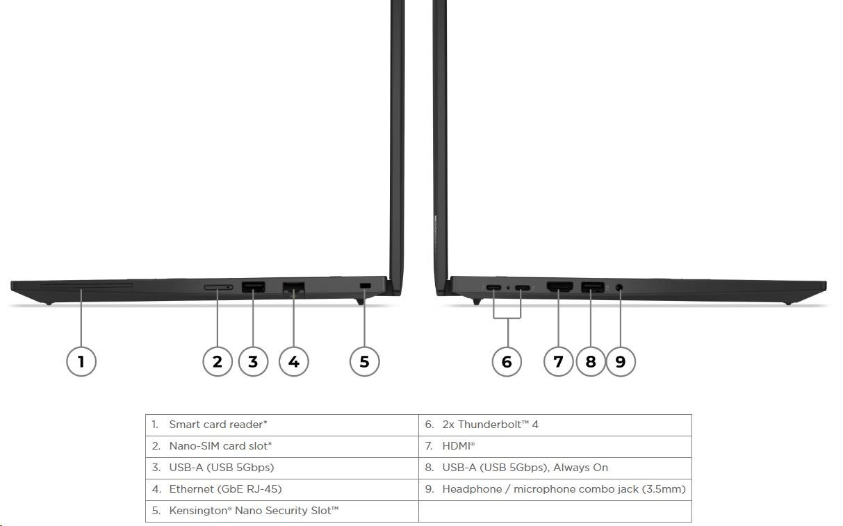 | Standartné porty | 1x USB-A (USB 5Gbps / USB 3.2 Gen 1) 1x USB-A (USB 5Gbps / USB 3.2 Gen 1), Always On 2x USB-C® (Thunderbolt™ 4 / USB4® 40Gbps), with USB PD 3.0 and DisplayPort™ 1.4 1x HDMI® 2.1, up to 4K/60Hz 1x Headphone / microphone combo jack (3.5mm) 1x Ethernet (RJ-45) 1x Security keyhole |