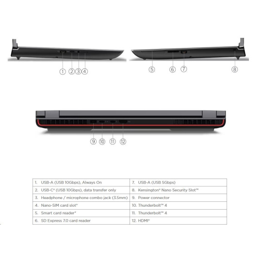 | Standartné porty | 1x USB-A (USB 5Gbps / USB 3.2 Gen 1) 1x USB-A (USB 5Gbps / USB 3.2 Gen 1), Always On 1x USB-C® (USB 10Gbps / USB 3.2 Gen 2), with USB PD 3.0 2x Thunderbolt™ 4 / USB4® 40Gbps (support data transfer, Power Delivery 3.0 and DisplayPort™ 1.4) Models with NVIDIA® graphics: 1x HDMI® 2.1, up to 8K/60Hz 1x Headphone / microphone combo jack (3.5mm) 1x SD Express 7.0 card reader |