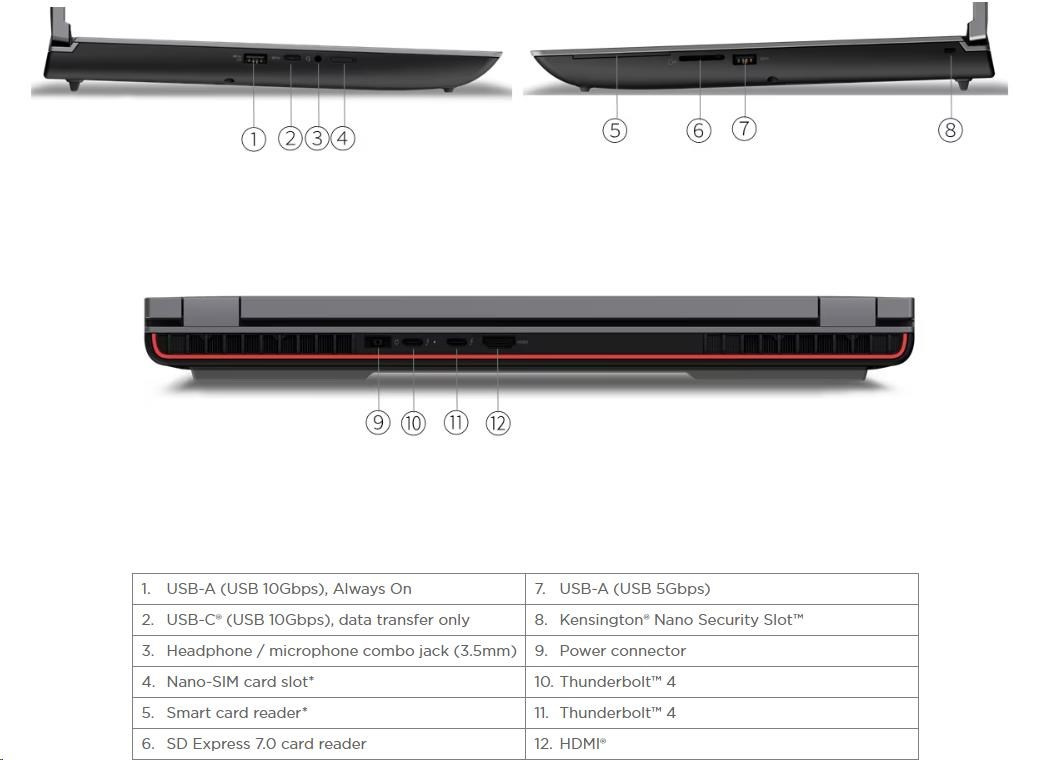 | Standartné porty | 1x USB-A (USB 5Gbps / USB 3.2 Gen 1) 1x USB-A (USB 5Gbps / USB 3.2 Gen 1), Always On 1x USB-C® (USB 10Gbps / USB 3.2 Gen 2), with USB PD 3.0 2x Thunderbolt™ 4 / USB4® 40Gbps (support data transfer, Power Delivery 3.0 and DisplayPort™ 1.4) Models with NVIDIA® graphics: 1x HDMI® 2.1, up to 8K/60Hz 1x Headphone / microphone combo jack (3.5mm) 1x SD Express 7.0 card reader |